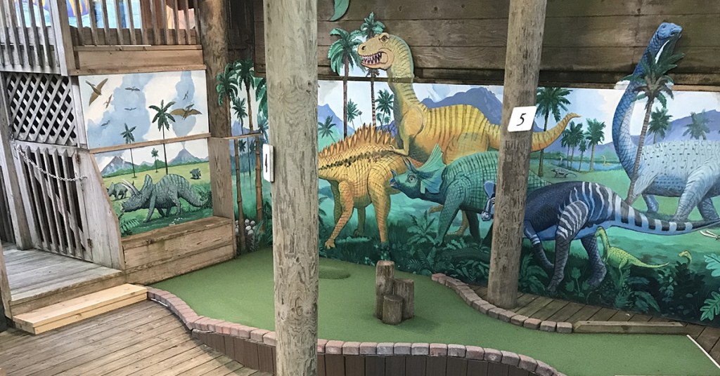 We had quite a time trying to get into Club 18 Miniature Golf; we tried one evening but realized a bit too late that they were cash only. By the time we got the cash, five other groups had started, so we decided to punt to another night. We went again later in the week, but it was a bustling Saturday night with a lot of kids around. So if you are someone who likes a more quiet game of mini golf, try going in the off hours as Club 18 is definitely a popular spot! The theme at Club18 is dinosaur-adjacent, but we must compliment the paintings and murals around their facility; it definitely looks professional! We had a bit of difficulties with some of the greens as it looks like some of the hills are very sharp instead of sloped (see the bottom of the picture at right), which really affected some of our putts. However, the turf is very well maintained. The three story structure is a really interesting environment, and the vine canopy over the first floor is definitely a really interesting touch.