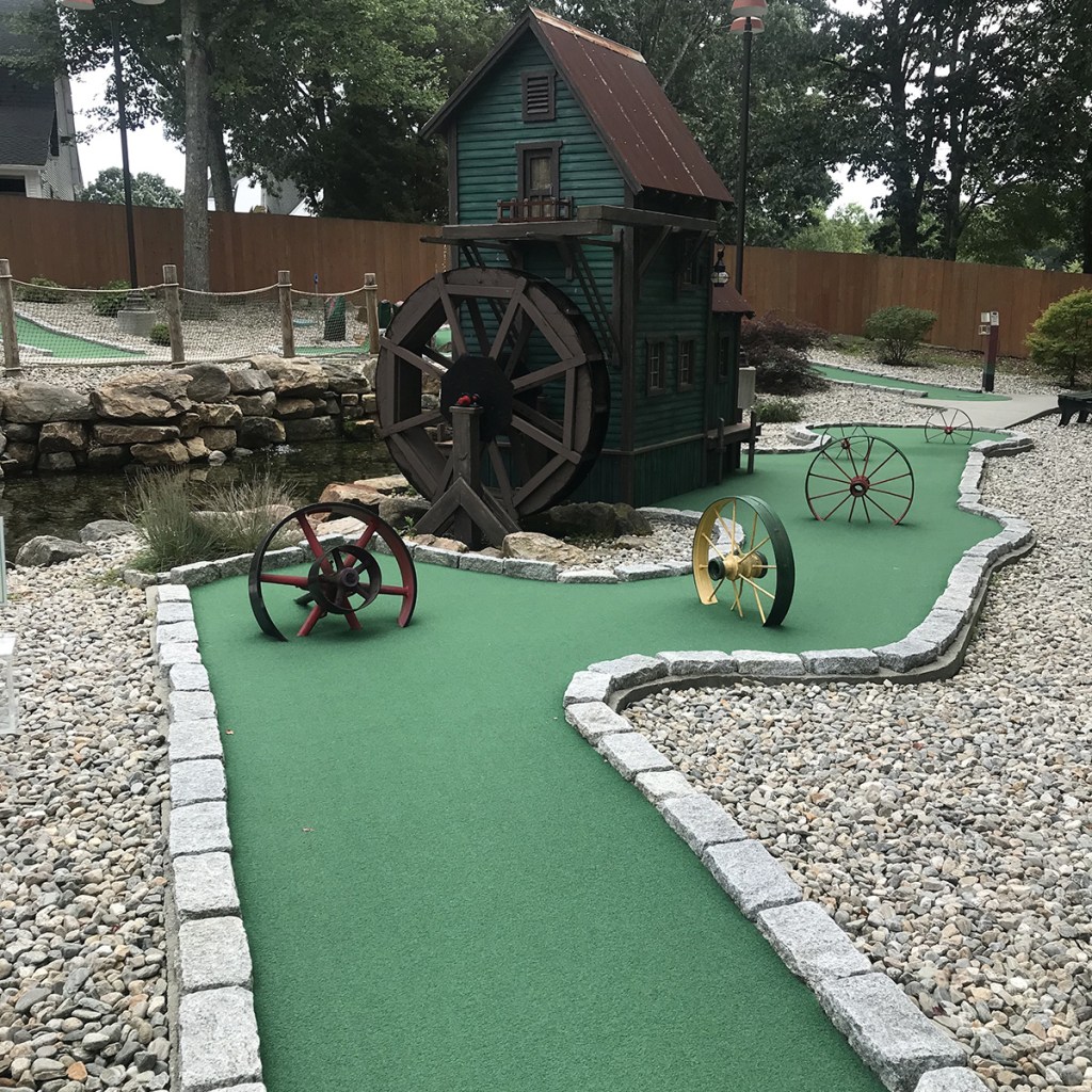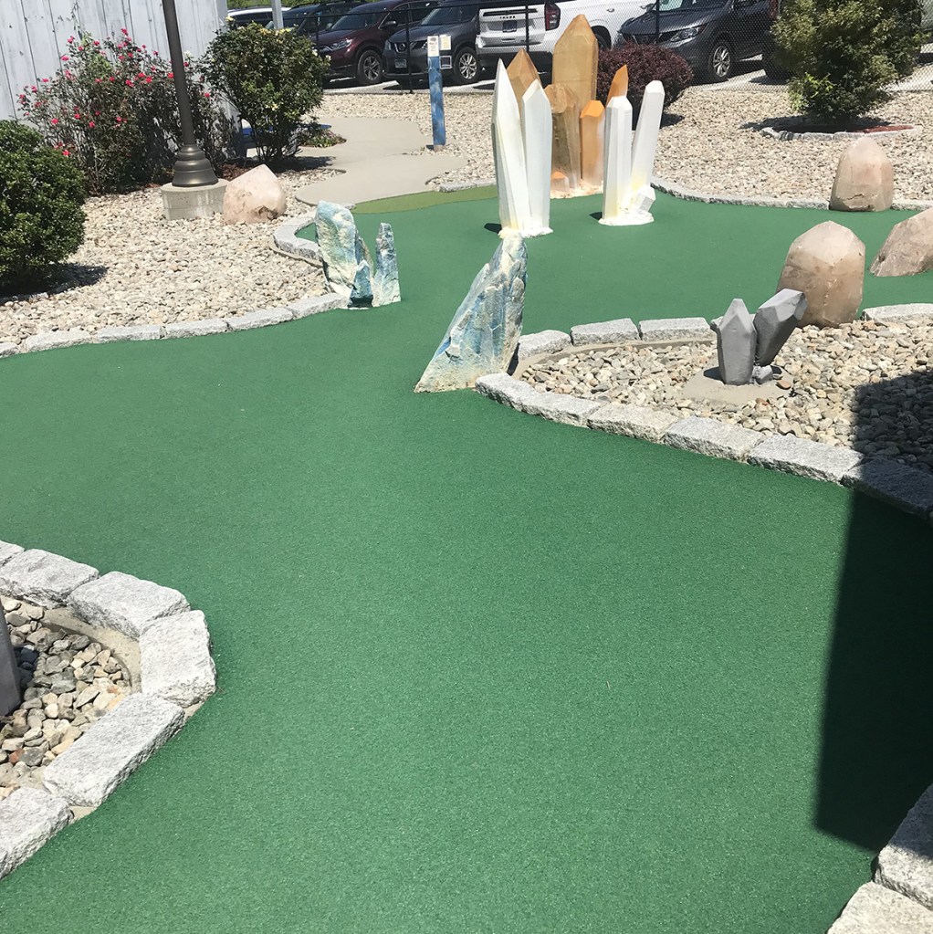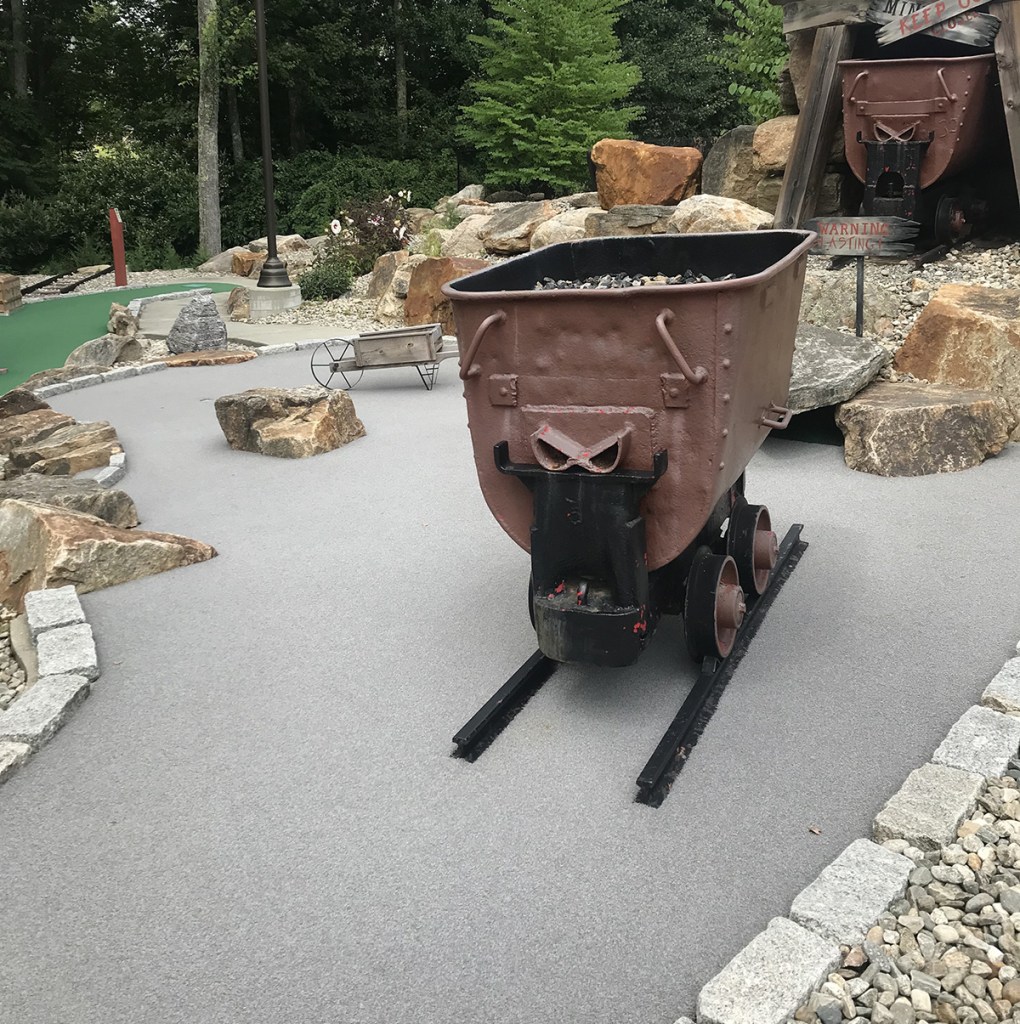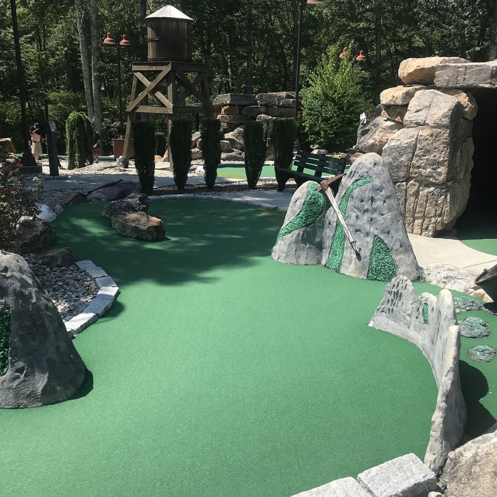The course theme is “Old West Mining Town”, which fits in well with some of the shops around Nature’s Art Village dealing with mining and materials. Each hole features facts about a different type of rock. While the theme holds up for most of the holes, it kind of deteriorates (or maybe explodes) with an oversized snake and a polar bear (still trying to figure this one out), but it is clear the course has been extremely well kept. The turf looked almost new, and all the surrounding buildings and animals were all beautiful.