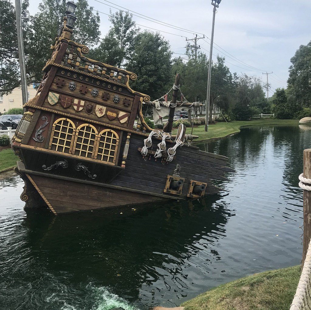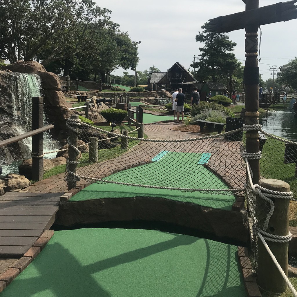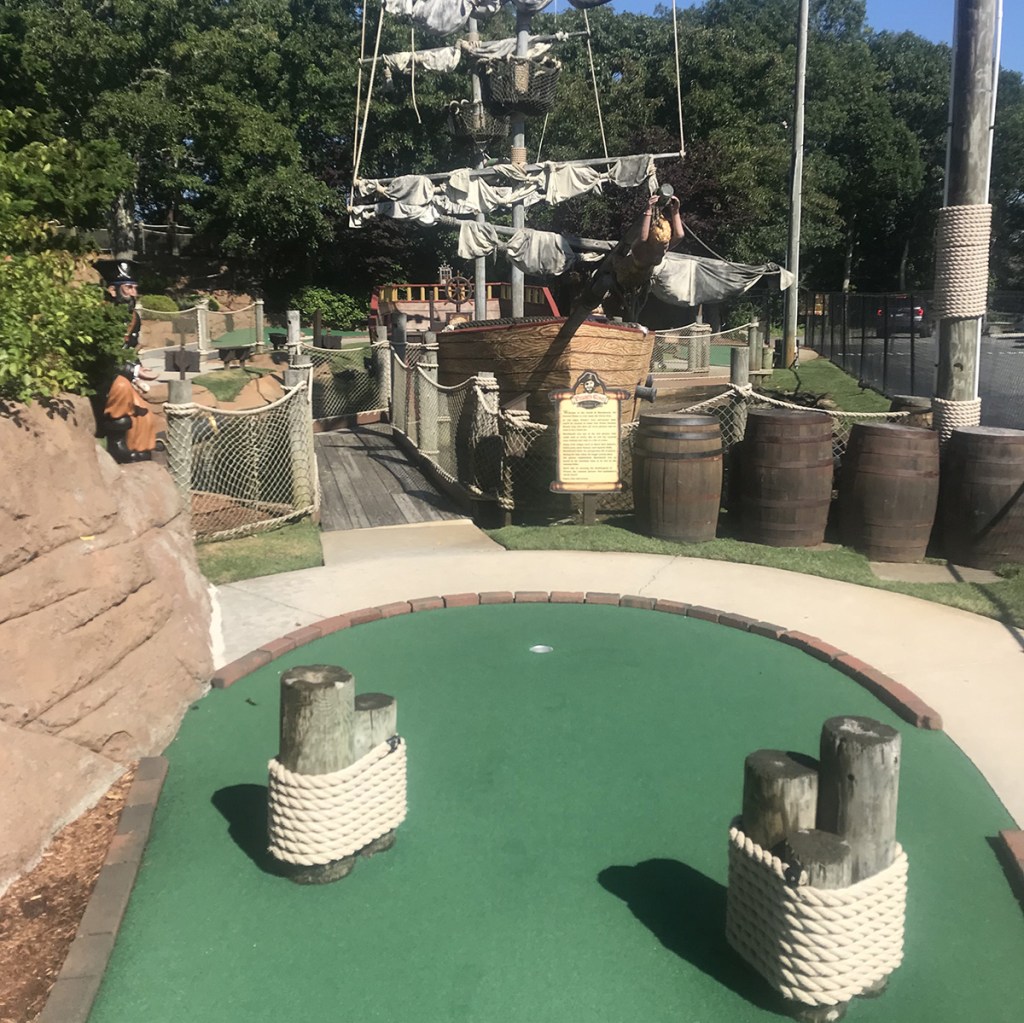 Pirate’s Cove is probably one of two of the most popular miniature golf courses in Cape Cod (the other being Skull Island). Whether that be because of their location or because of their towering structures or because of their wide commercial appeal, we can assure you that you will never be alone on the course. Even arriving at 9:30 (prior to a 10am opening), we were second in line, and by the time the opening bell rang, there were about 6 or 7 groups behind us. We decided to play just one course, and we are glad we did because as we left there were about 10 groups waiting before the 1st hole of the next course. So it’s definitely a popular destination.