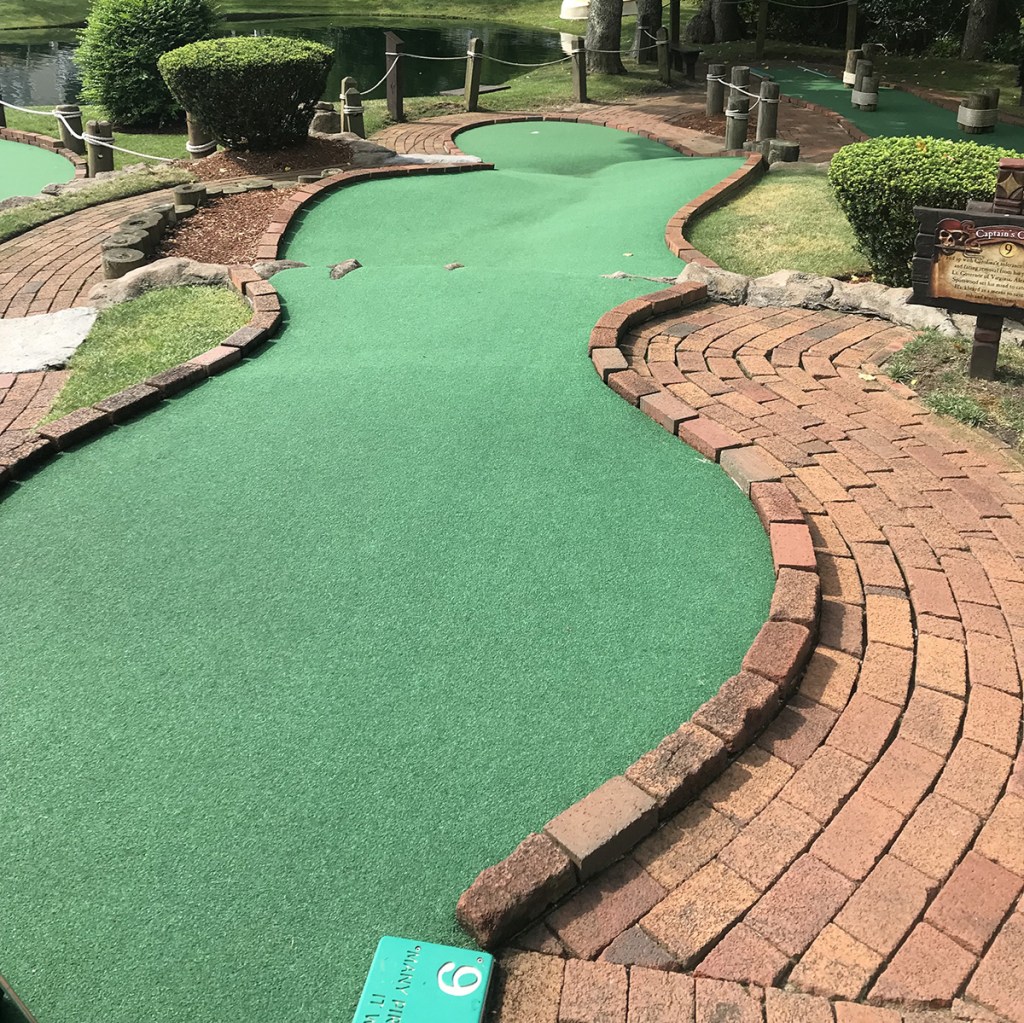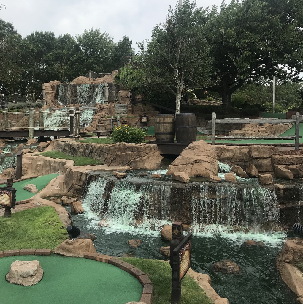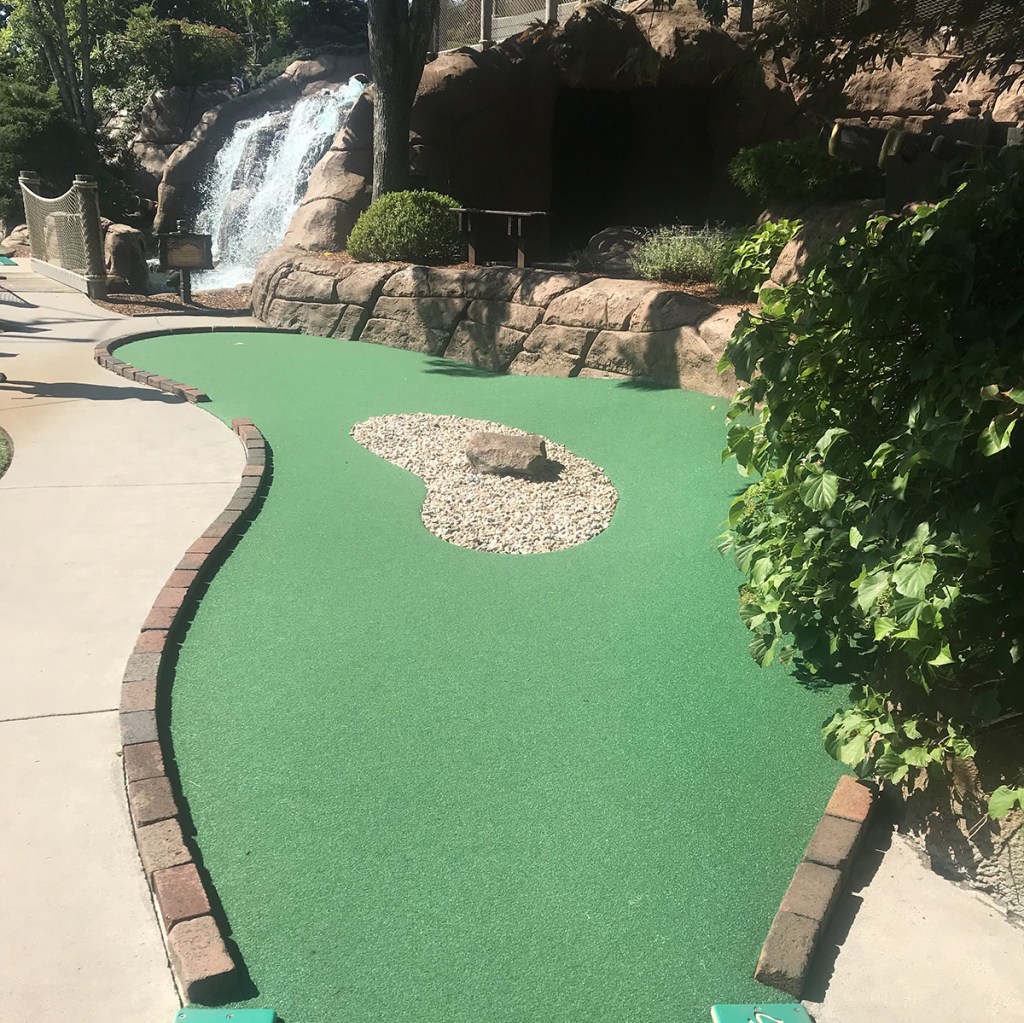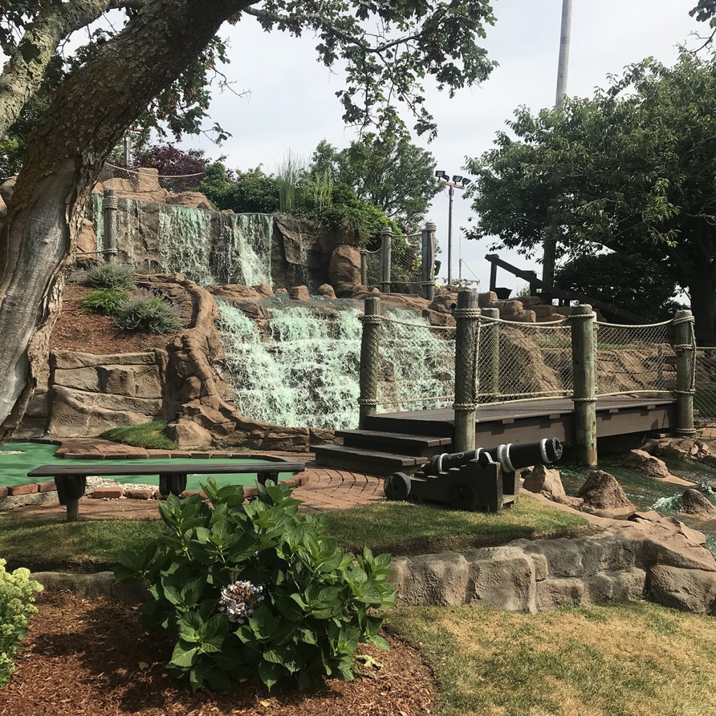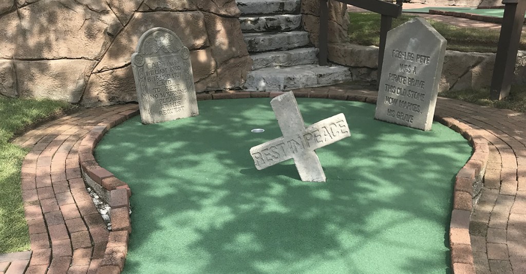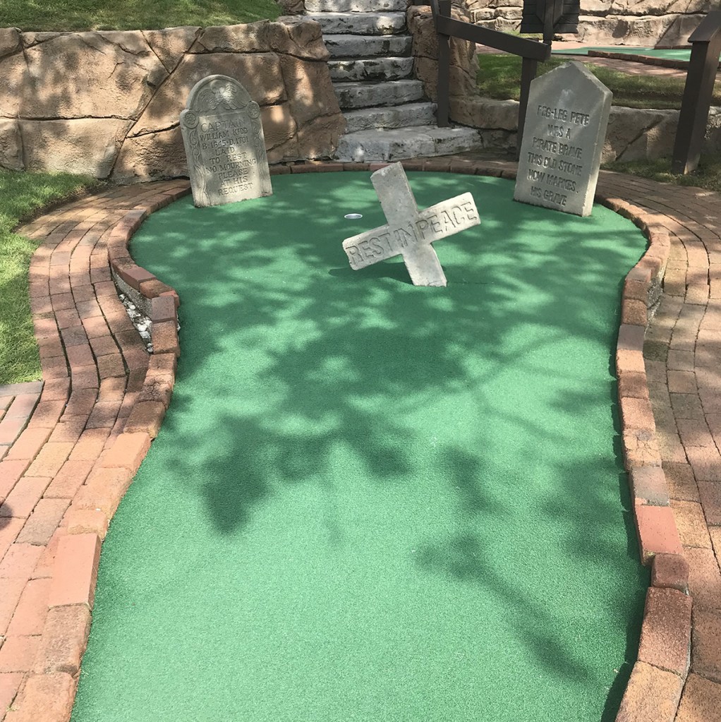 The courses are always kept in impeccable conditions, and they do a tremendous job at immersing you in the environment. Fun pirate facts dot the course, and a massive sunken ship is eye-catching from the highway. Most of the barriers you are dealing with are rocks and water, but several straight on putts make it just a tad bit easier than we like.