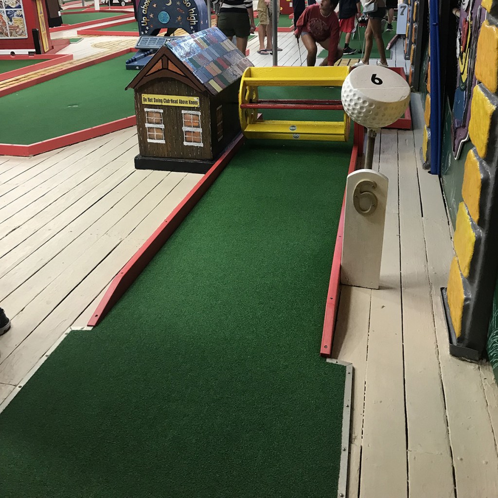 Tee Time is probably exactly what you think of when you think “mini-golf”. It’s bright and colorful, with all the classic obstacles. With the tournament having just passed, all the obstacles had a brand new coat of paint and were in top condition, and the turf was brand new as well (although it may have not been totally adhered to the ground in some areas). The course is very much hand made, but in a little more of a polished way than that of Sandwich Mini Golf, for example. The 20-holes are squeezed into a one level, 5000 sq ft sliver of the Boardwalk, which can make it a little hard when it gets crowded, but the holes never seem ridiculously short, and it never gets the ridiculous crowds like on the main boardwalk area.