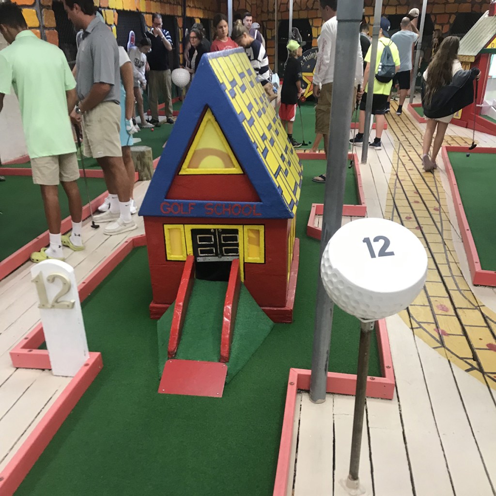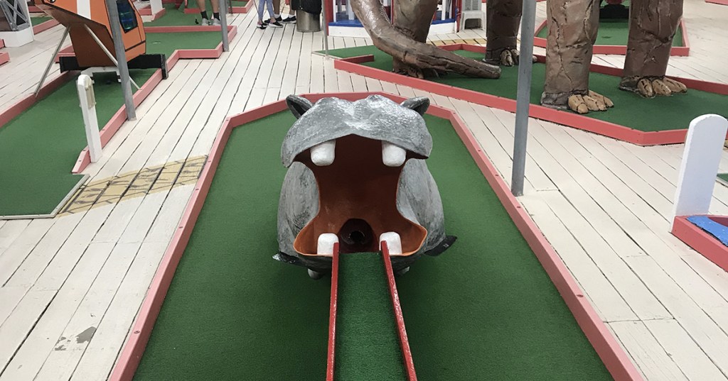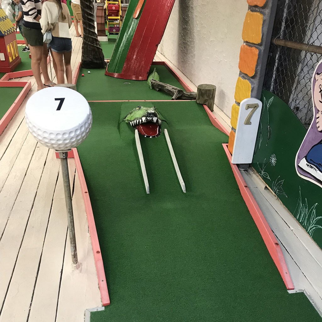 While some may characterize Tee Time as a “children’s course” (and they wouldn’t be wrong; in fact, we had avoided this course for years because of that thought!), there is a tremendous amount of work that goes into all the up keep this course requires, and it really shines when you take the time to look around. The murals on the walls are all impeccable, and the obstacles themselves are unique and interesting, from Lucy the Elephant to Fred Flintstone and Barney to the more classic windmills and dinosaurs. The holes are not the overly simplistic “hit-it-in-the-box-for-a-hole-in-one” kind that you will see at Golden Galleon (although there are at least 4 or 5 here), but every hole is a possible ace opportunity if you get the right bounce and play the right obstacle.