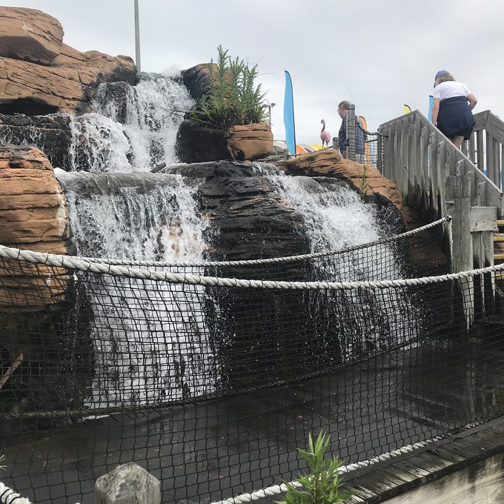 The course takes you through multiple levels along rocky paths that weaves its way through the property, while still maintaining a bit of distance from those inside the waterpark. The first 5 holes are near the front, then you walk on a long plank towards the back of the waterpark for the next 9 holes, before returning for the next 4, one of which is a free game hole.