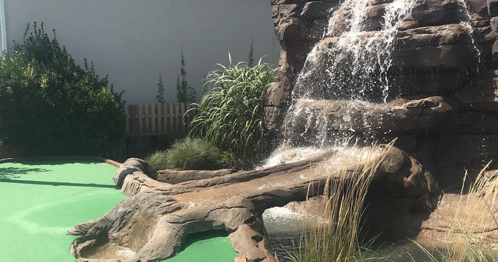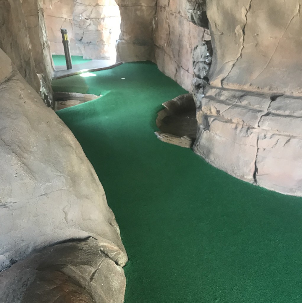 The course layout at Pirates almost alway features some larger waterfalls, as well a second level and a suspension bridge. At this location, the greens felt a little bit longer, but we benefited from having nobody else on the course when we played. We count only one “hit it in the box for a hole in one” type of hole here, but there are other opportunities for an ace if you use some good putting skills. The course is in very good shape, although it does rely on the cheaper carpet rather than the more expensive turf. The Avalon courses relies on normal construction bricks, but not all of them have their gaps filled in.