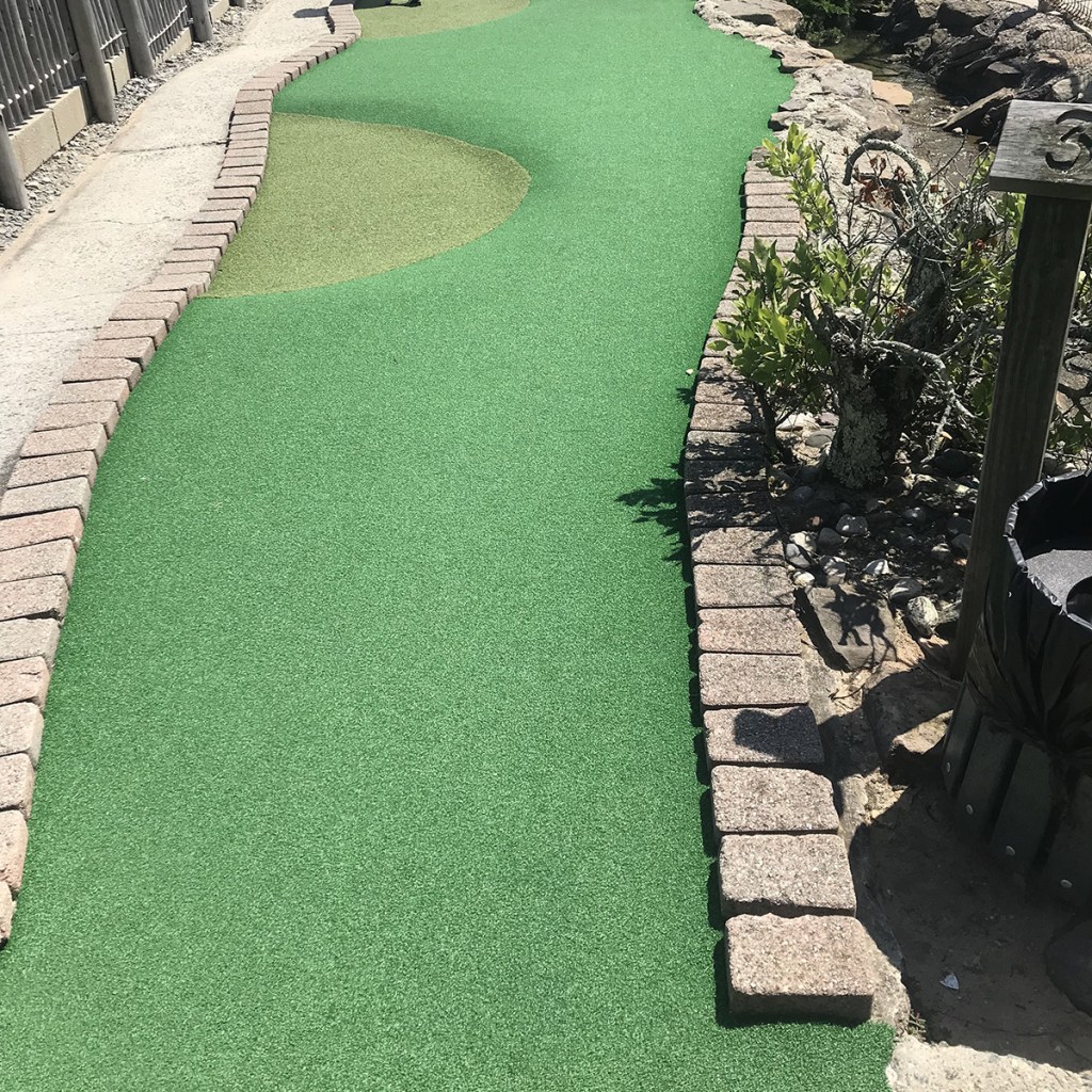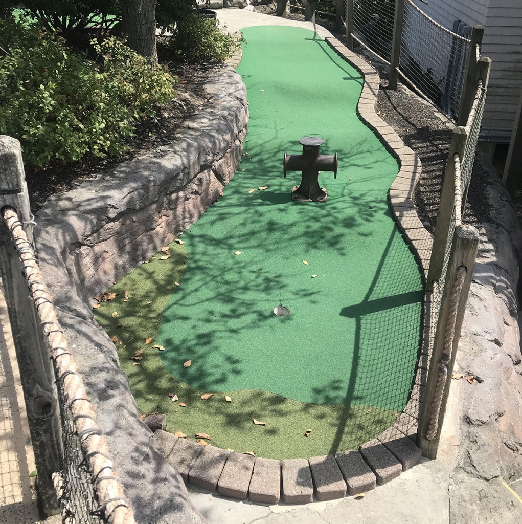 Settler’s Mill is actually a part of the Thundering Surf Waterpark, similar to the OC Adventure Golf in Ocean City, although the mini golf here sits alongside rather than under most of the waterpark. The course has the obvious markings of a Harris Mini Golf course, but seems to have plenty of land to work with, so the holes are always a pretty decent length. As we mentioned, we found out that the course has just finished being completely re-carpeted so everything was in top condition. The course did have some issues with leaves, but we didn’t expect anyone to be manicuring a waterpark course.