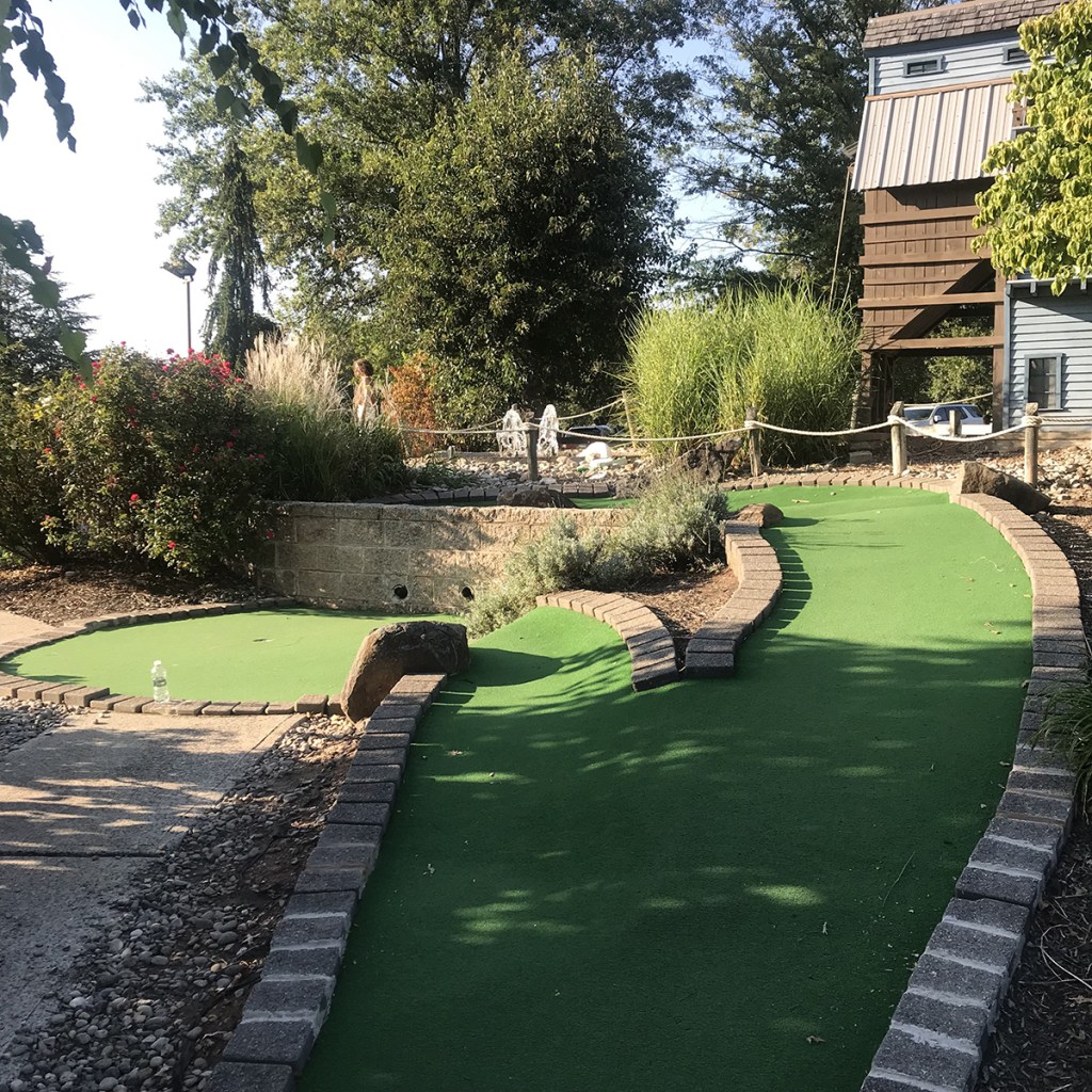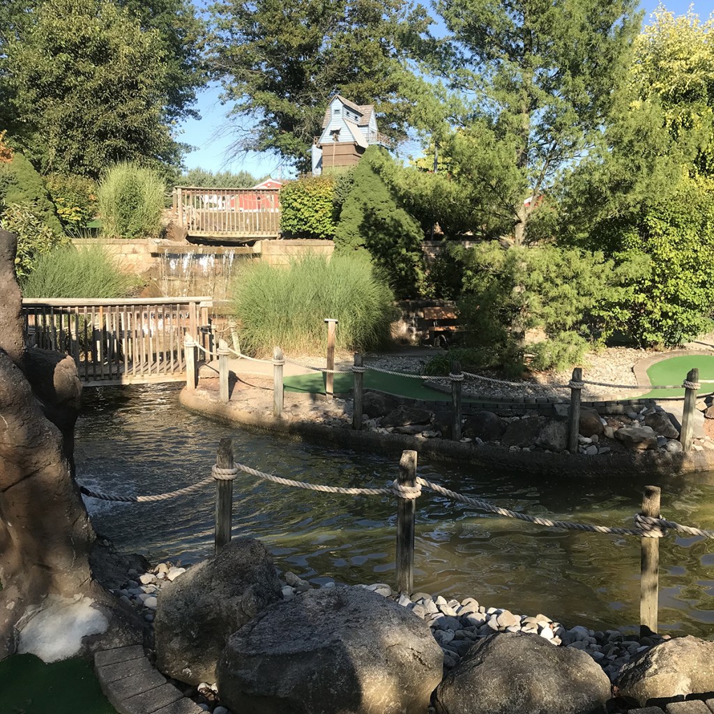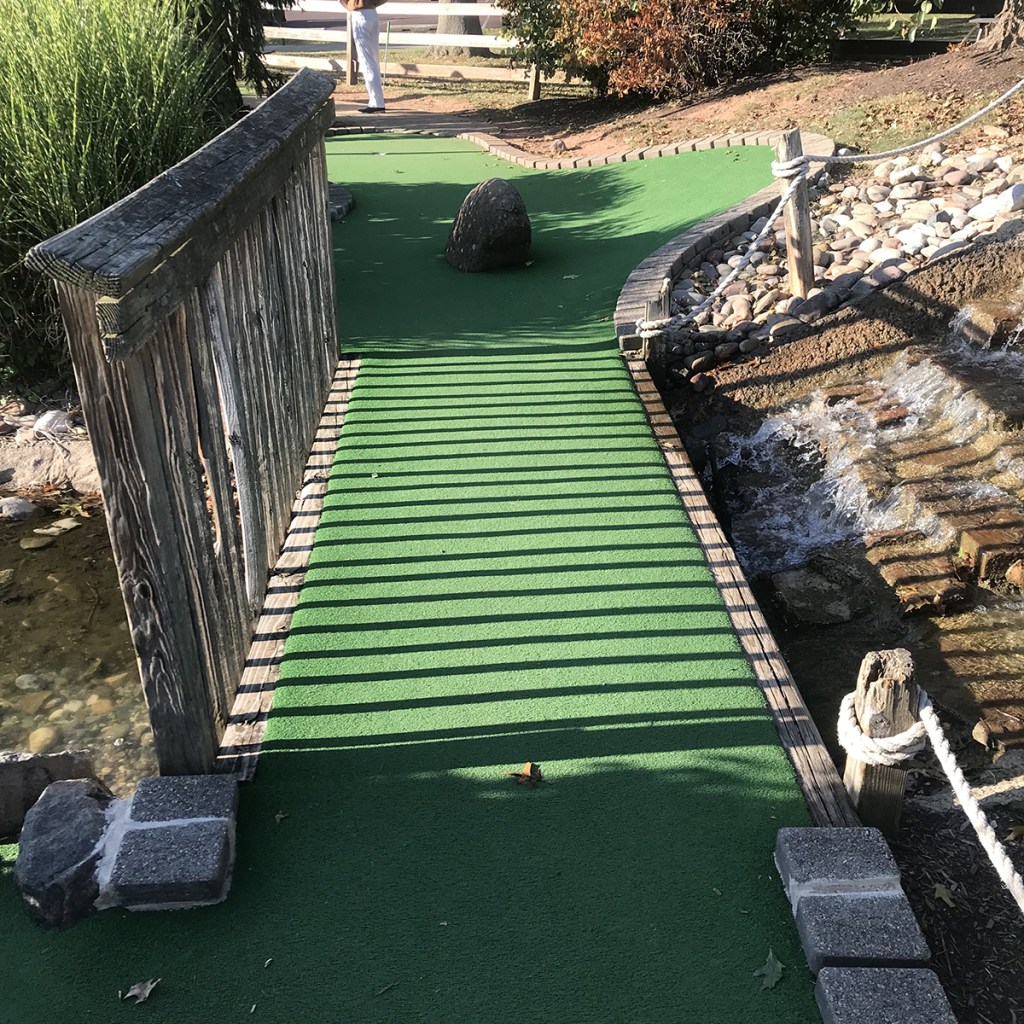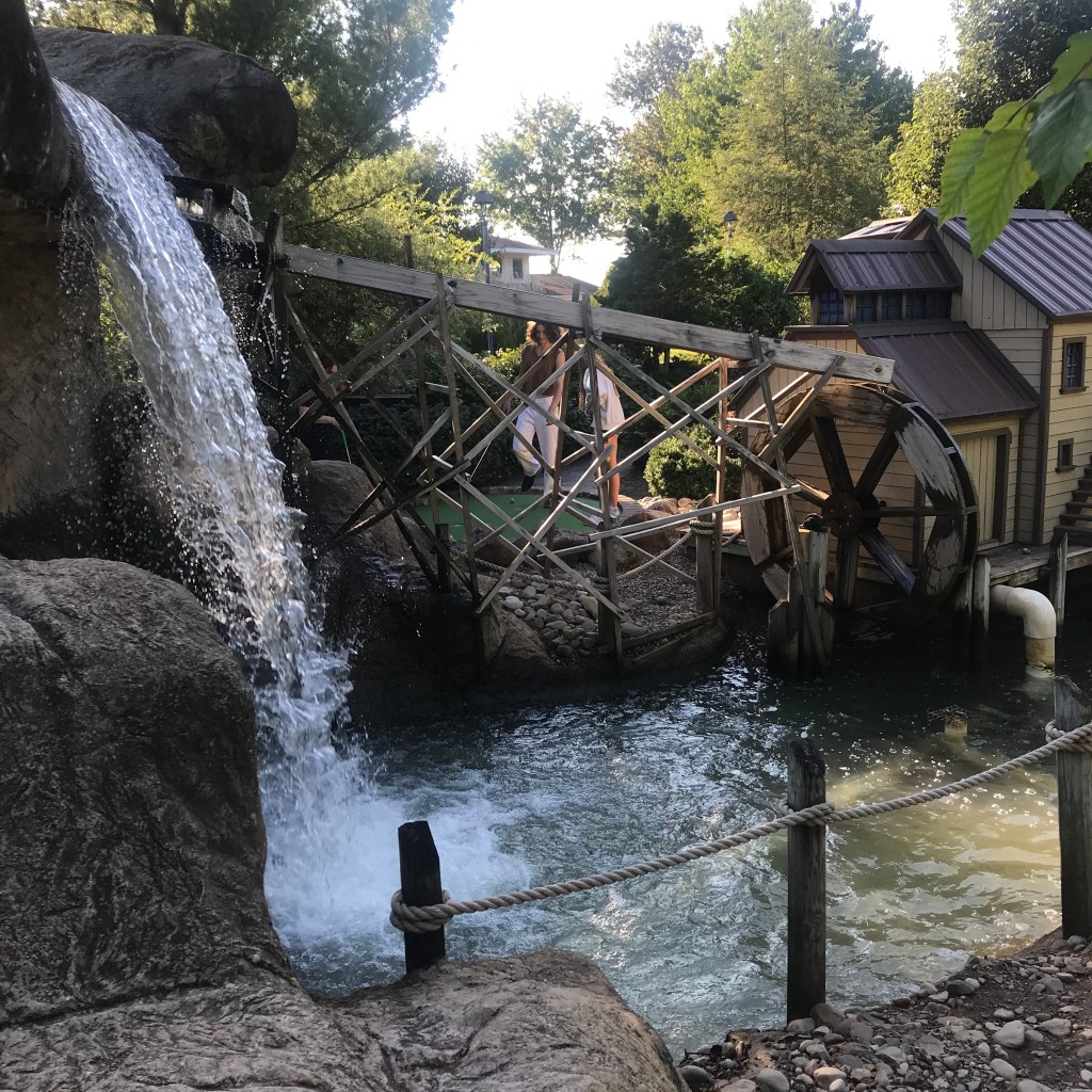 There are two courses located on the property, and probably one of the few places where the courses are actually totally separate from each other, as land certainly doesn’t seem to be a problem here. Our first course is called Waterfront Adventure, and featured some pretty beautiful water features, a gris mill, and several rustic buildings in beautiful condition. The water was a bit grimy in some places, but overall provided a nice atmosphere for the course. The course does have beautiful greenery, but it was a tad overgrown in parts where it would impede on our tee off or on our balls path.