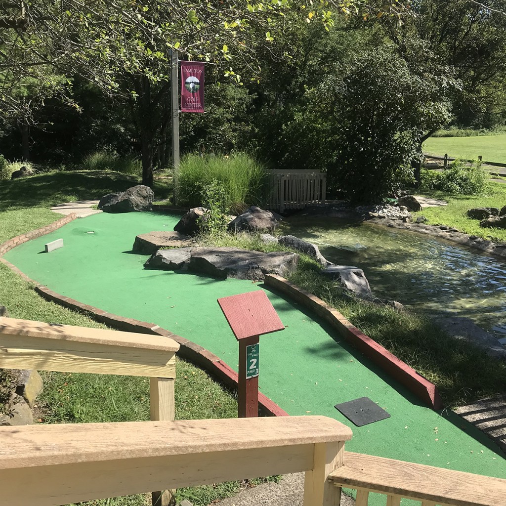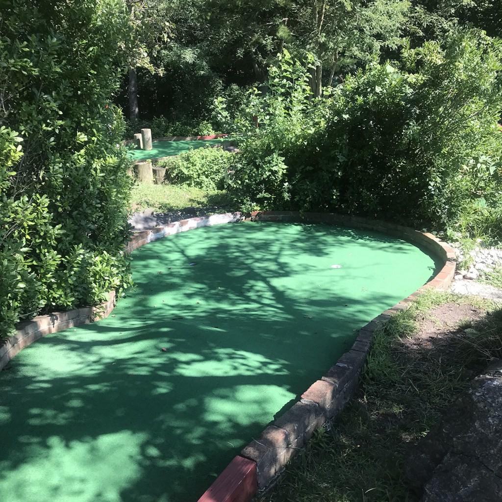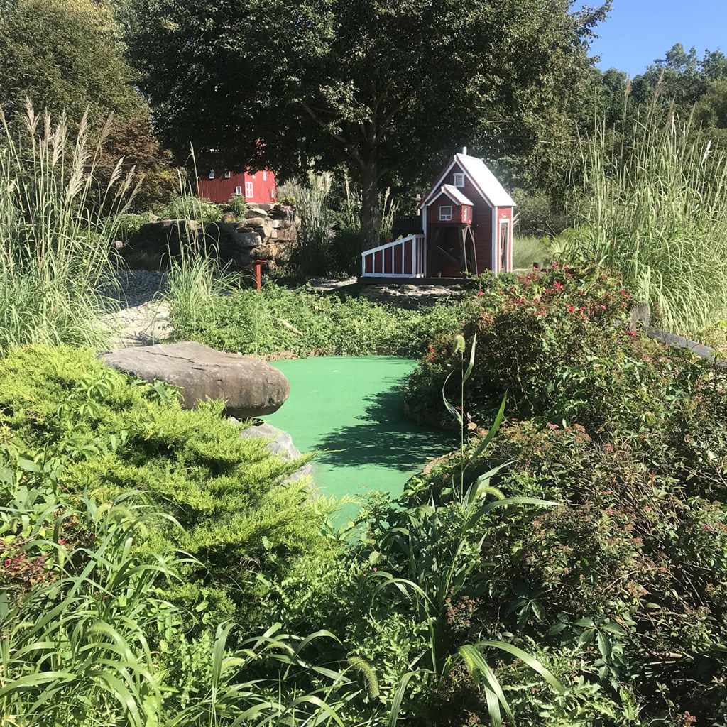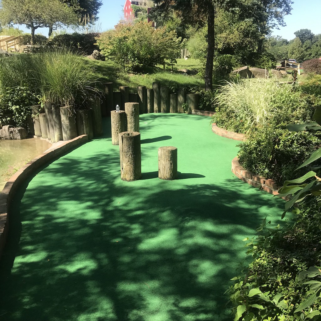 The course does have some nice smaller addons, like hand-painted houses and nice bridges next to a central waterfall. However, some of the water features clearly have drainage problems, because you can see that the holes around that area have pretty severe water damage. While there were no obvious rips or tears, you can tell that the course may be in need of a refresh. Because of this, the course also played incredibly quickly, increasing some of the difficulty here significantly. In addition, while there is plenty of plant life and greenery around the course, a good amount of it appears to be overgrown and verges on impeding in your game.