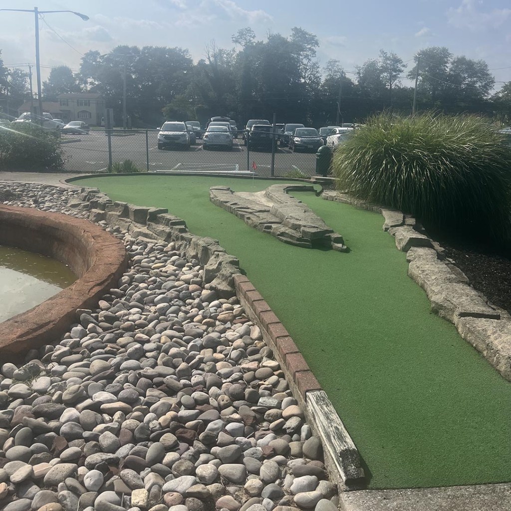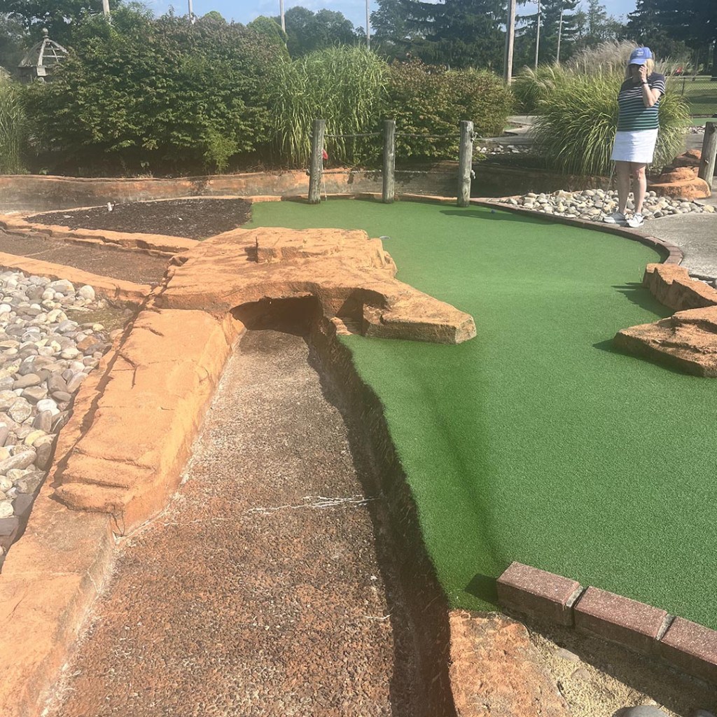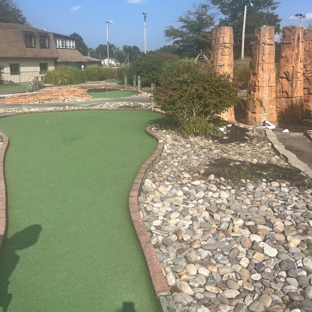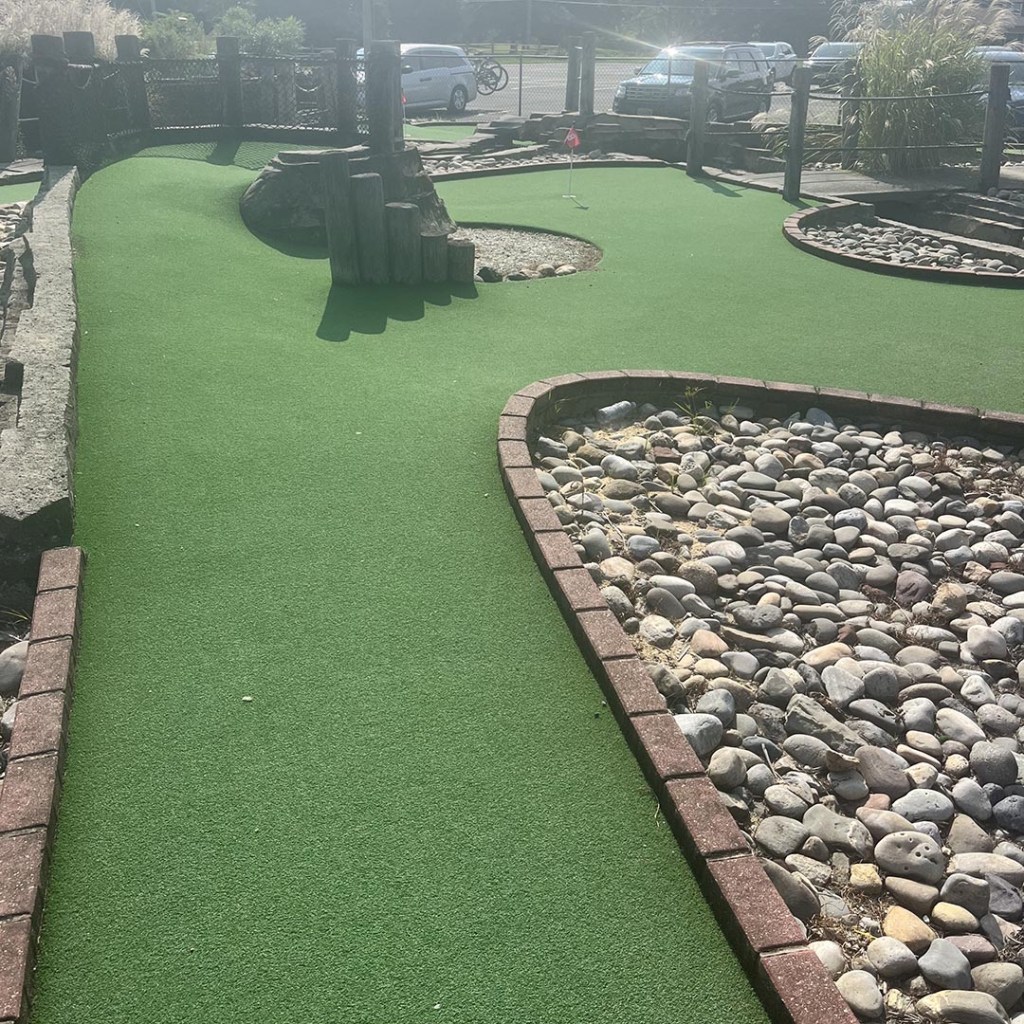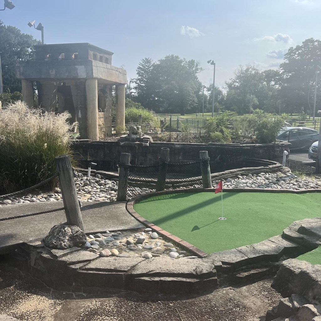 While it did look like the course turf had been repaired recently, some of the other features were decidedly lacking. There were smaller details, like small flags in metal cups, but there were also things like a large amount of standing water in the places were water should have been running. We also noticed that this course lack of water also was a detriment to gameplay as well, like the typical hole where you hit your ball in the stream to carry it to the hole did not have the water. There also seemed to be large clumps of mulch scattered throughout the course as well. While the course bills itself as a “Mayan” theme, it’s really just four pillars and one temple that give that theme. More could be done to really enhance the experience.